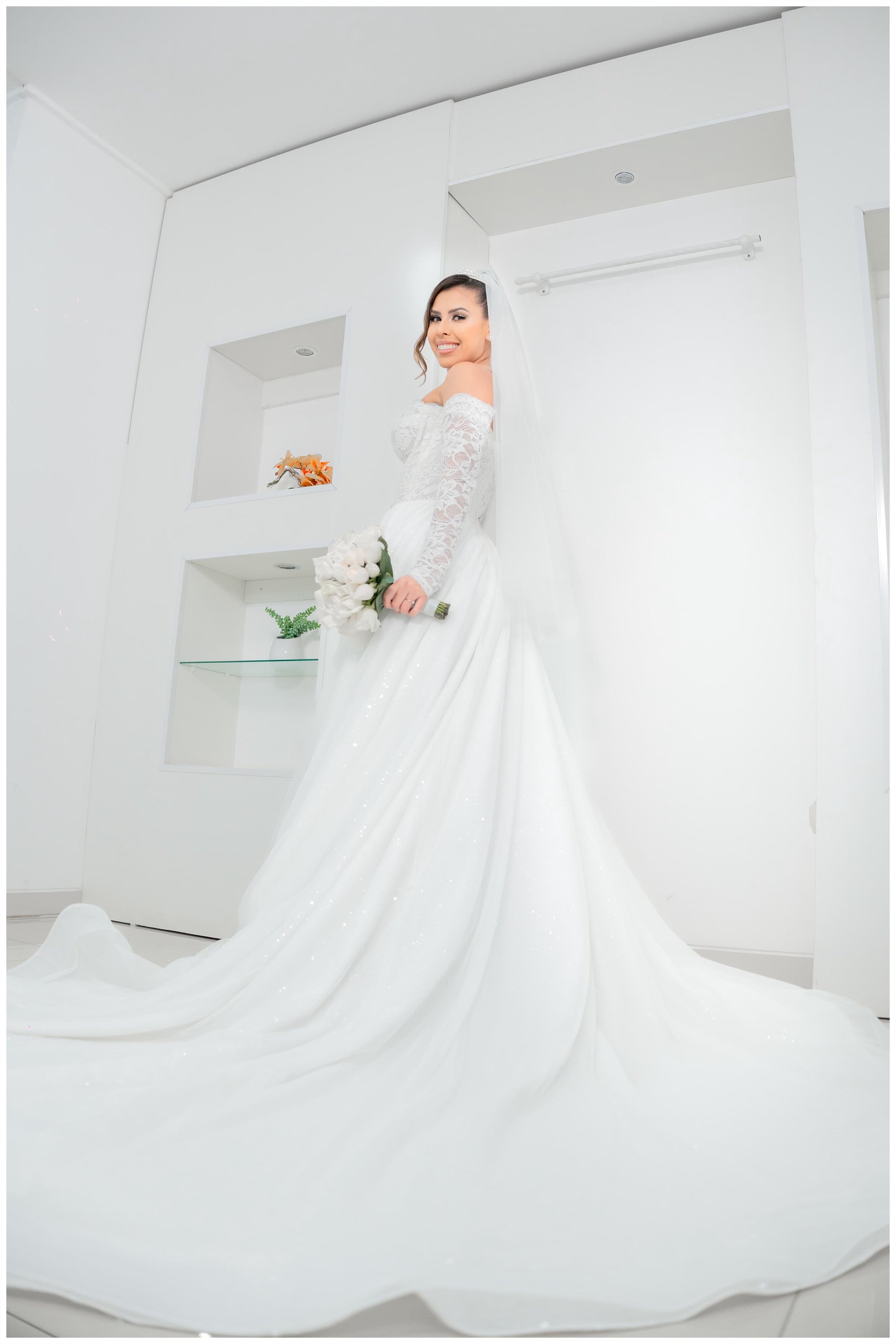 Vestido de novia realizado con un encaje francés con mangas y una falda amplia con capas de tul y una cola majestuosa